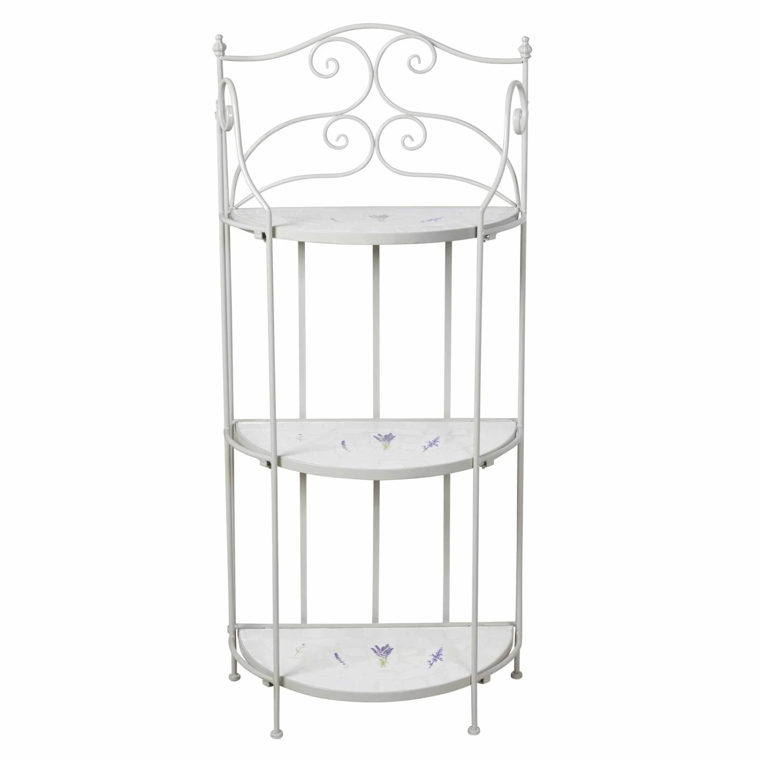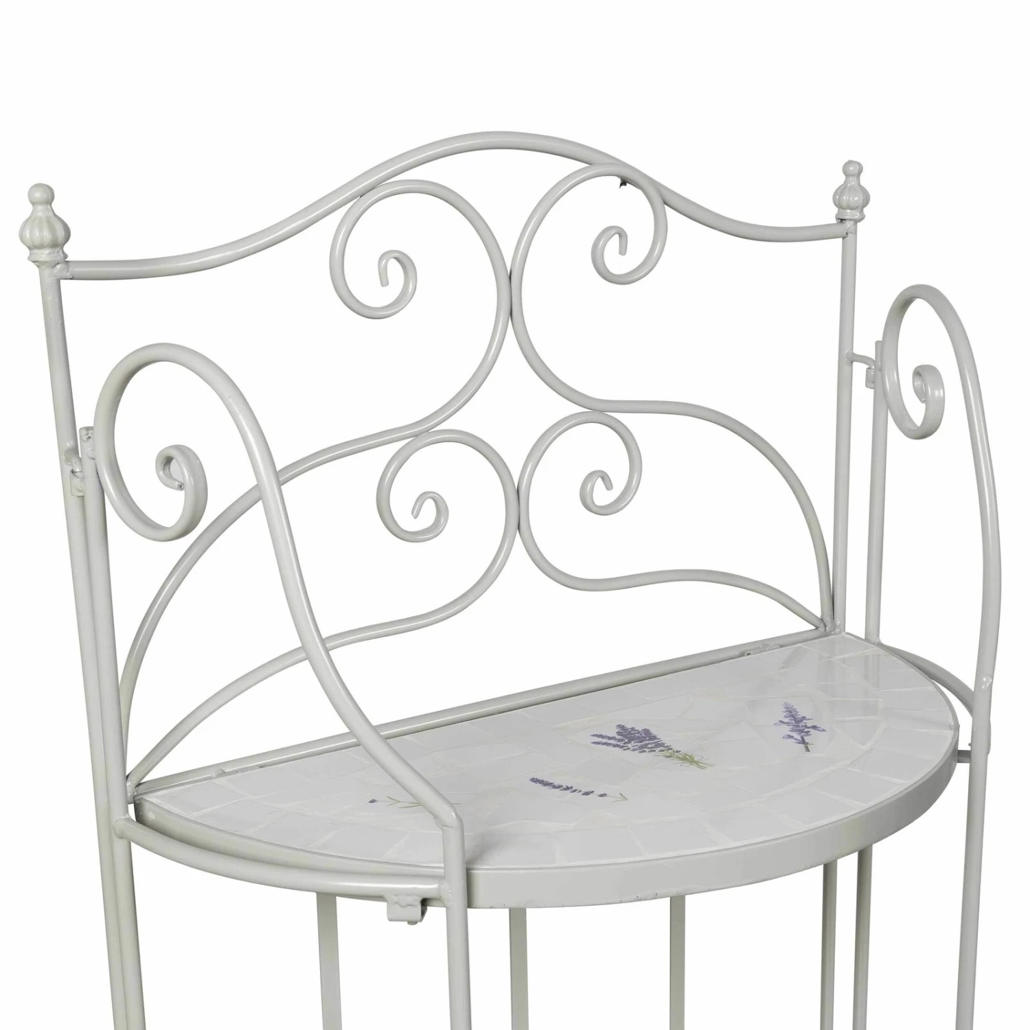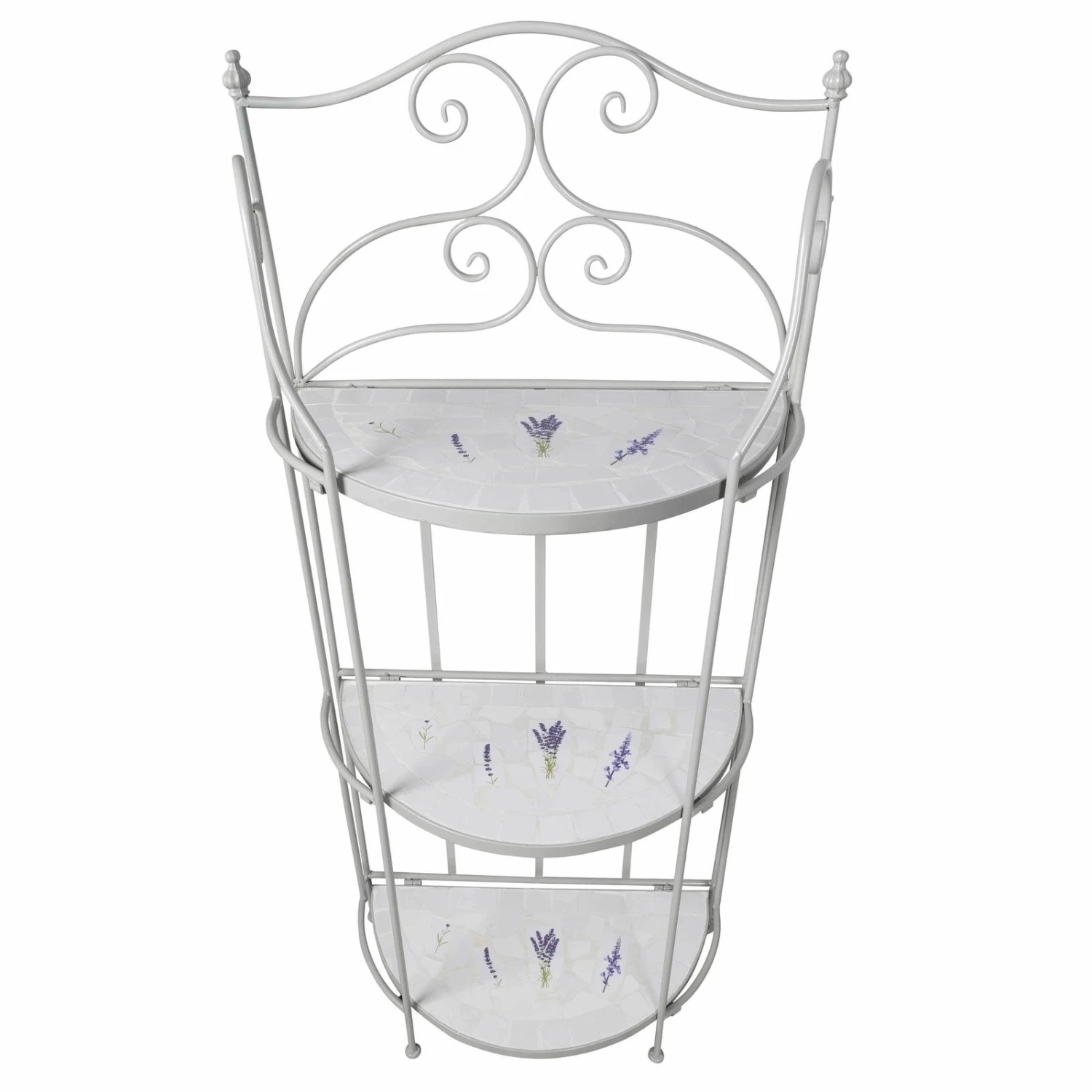 Dieses formschöne und funktionelle Pflanzregal avanciert im Outdoorbereich oder in Ihrem Wintergarten zu einem romantischen Hingucker. Das Regal Lille ist mit handgearbeiteten Lavendelfliesen aufwendig dekoriert, dabei ist jedes Möbelstück ein Unikat. Der gebogene Eisenrahmen verleiht dem Pflanzregal ein Plus an Stabilität. In einem rund 130 Zentimeter hohen Regal finden mehrere Pflanztöpfe und kleinere Kübel mit Ihren Lieblingsgewächsen Platz. Dazwischen lassen sich Figuren und Vasen gekonnt in Szene setzen. Beachten Sie bitte, dass das Mosaik-Regal Lille am besten in überdachten Räumen zu nutzen ist. Befreien Sie das Regal von Verunreinigungen mit einem weichen, feuchten Putztuch und nutzen Sie nur schonende Reinigungsmittel.